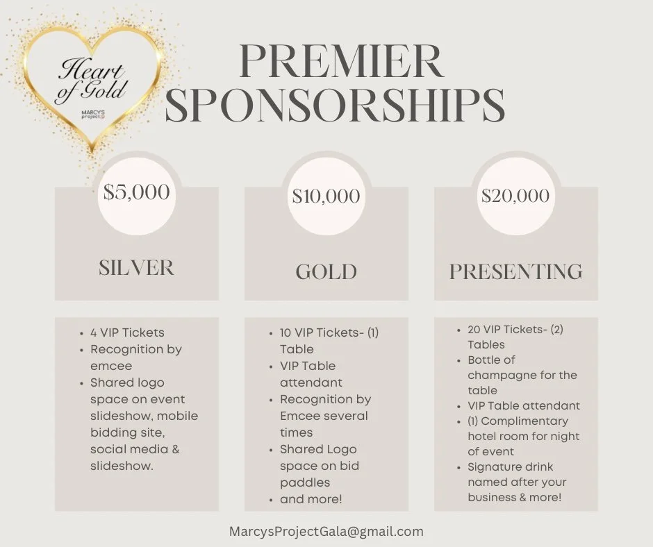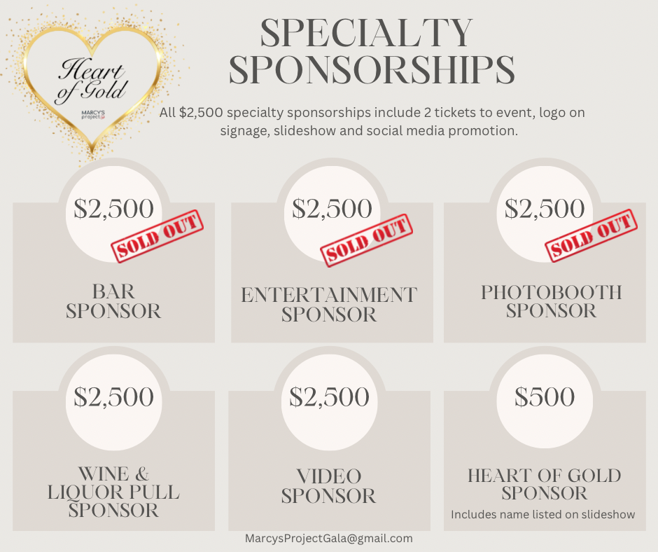 To purchase a sponsorship, tickets, or to donate, follow the link to the Heart of Gold Gala event page and click “Buy Tickets.” Sponsorships and tickets will all be available under that section.